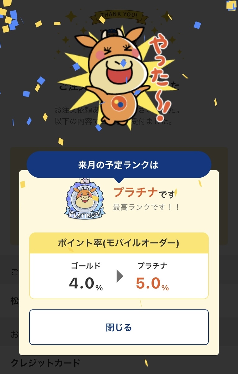 トップ > 食レポ投稿 > 松屋全般(限定メニュー含) > 豚カレーとプラチナ会員昇格 たね 2022/04/29 08:12 豚カレーとプラチナ会員昇格 昨日の朝食に豚めしとオリジナルカレールーを注文。こっちのカレールーとも相性は最高。個人的に、こっちのカレールーの方が若干辛みが強めな印象も受けた。 そして、月末ギリギリに何とかプラチナ会員昇格に間に合った。MOオーダーの還元率5%はありがたい。店内注文でもそこそこポイント頂けるのは嬉しい。 ありがとう松屋。来月の定番化メニュー存分に食べさせて頂きます。(創業カレーはまたいつか会いましょう) いいね 共有する 共有する X facebook LINE リンクをコピー コメントする 1 件の返信 (新着順) ミュートしたユーザーの投稿です。 投稿を表示 松屋のたけむー 2022/05/02 18:33 プラチナおめでとうございます👏 いいね 返信する ミュートしたユーザーの投稿です。 投稿を表示 たね 2022/05/03 11:05 こんにちは。 無事にプラチナに届きました。 目標は今月も頑張って何とかプラチナ維持です。 いいね 返信する