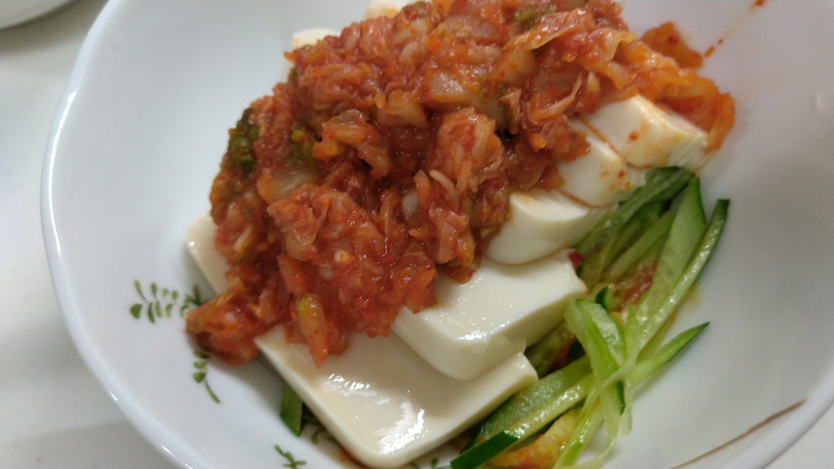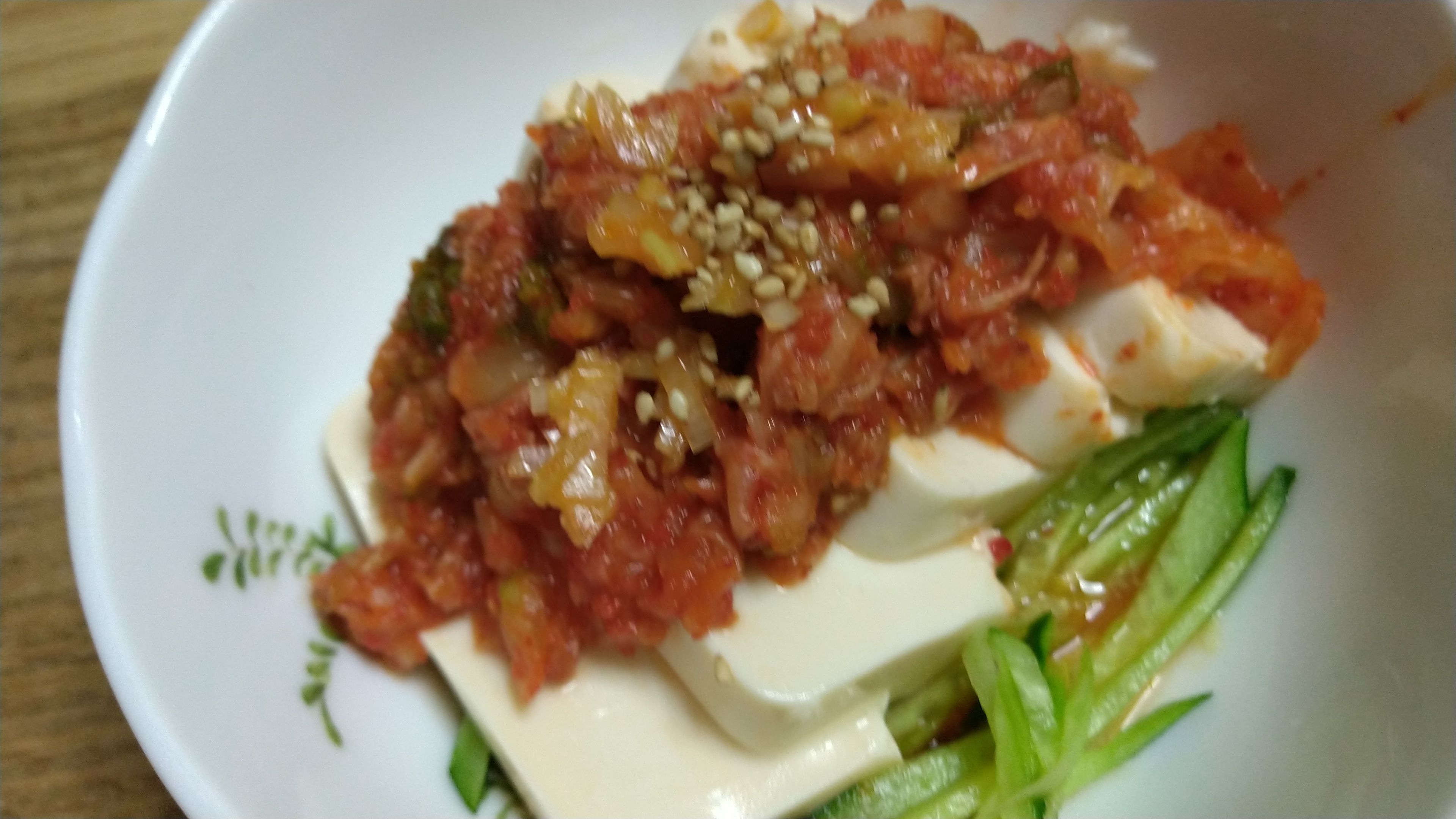 3.お皿にキュウリを敷き詰めて、お豆腐を乗せ、キムチ、白ごまを乗せたら完成。