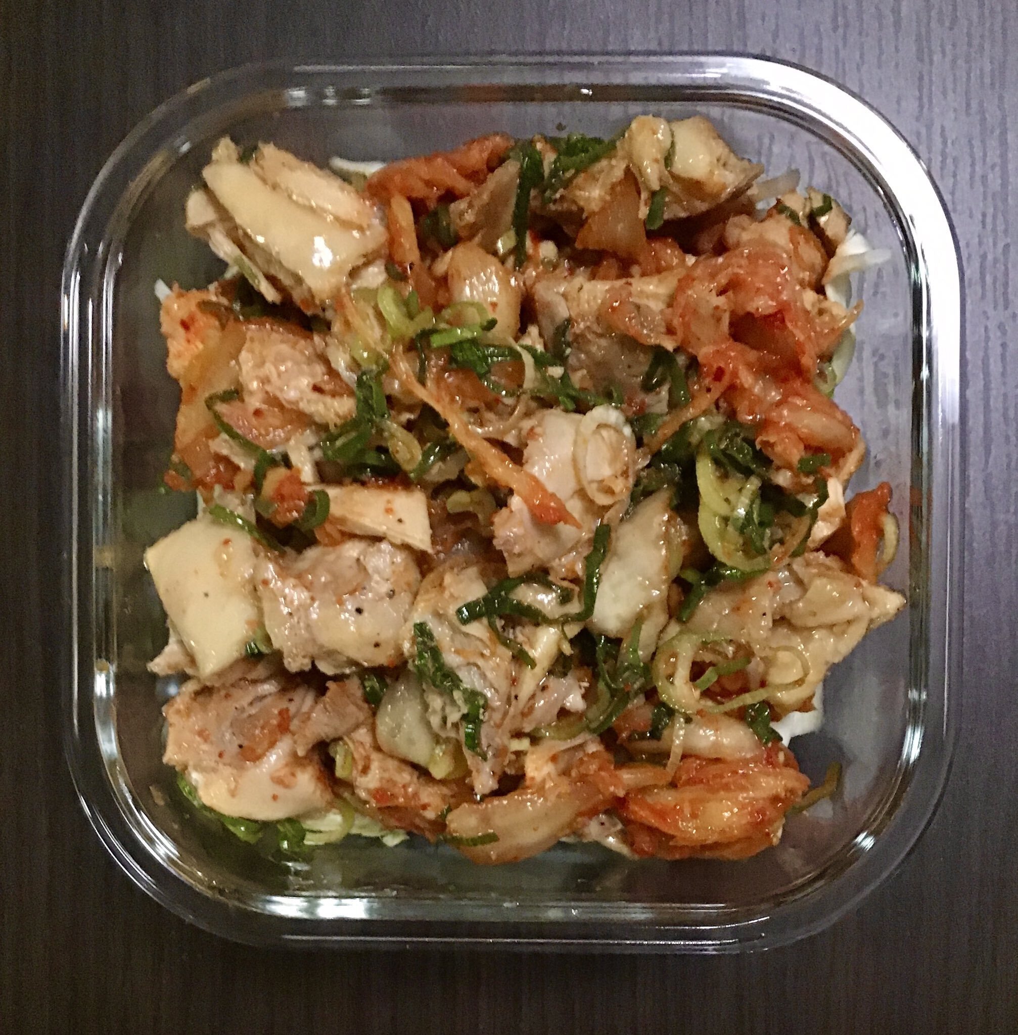 ① ネギ塩チキングリルは一口サイズにカット、焼肉のタレとキムチで和えておく。