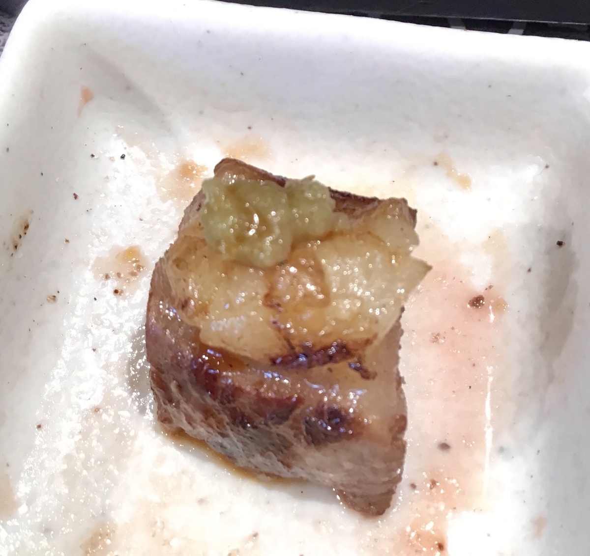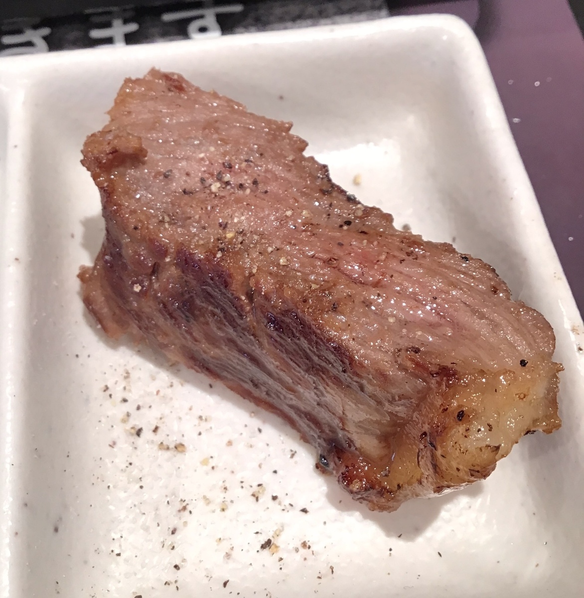 黒毛の脂身に近い部分を、柚子胡椒と醤油で食べてみたら、