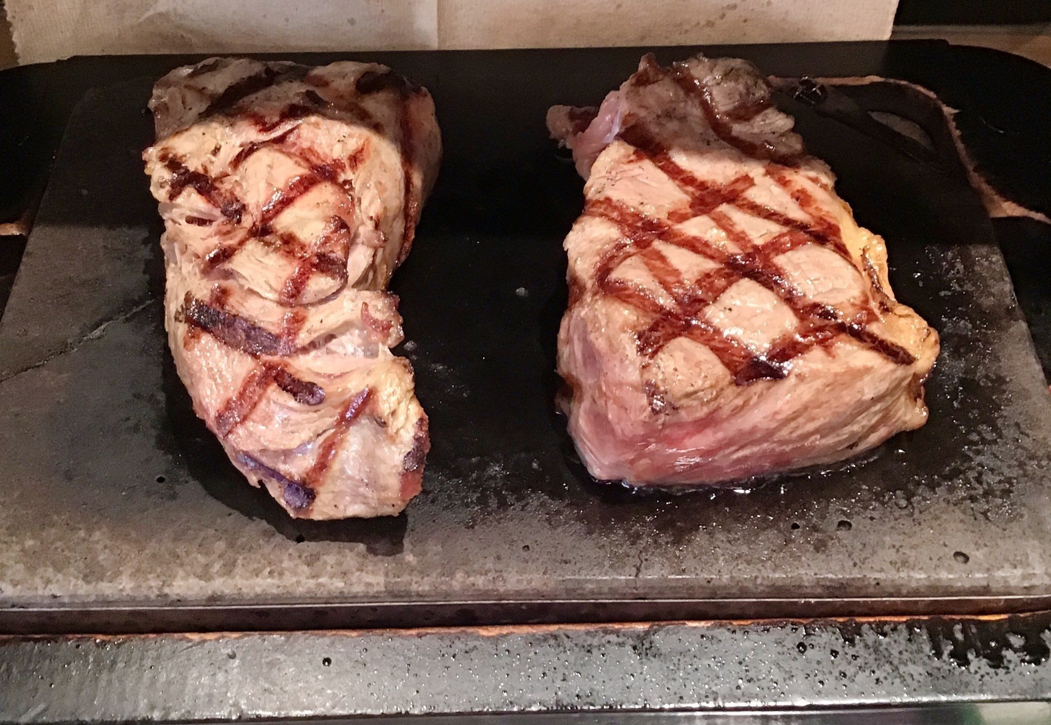 ジュージュー音を立てながら、お肉登場。まずは松の方(左側)を塩胡椒で。