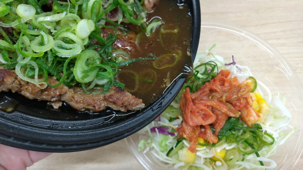 - 生野菜にネギ塩、キムチを乗せ、厚切りネギ塩豚焼肉丼のタレをかけます。