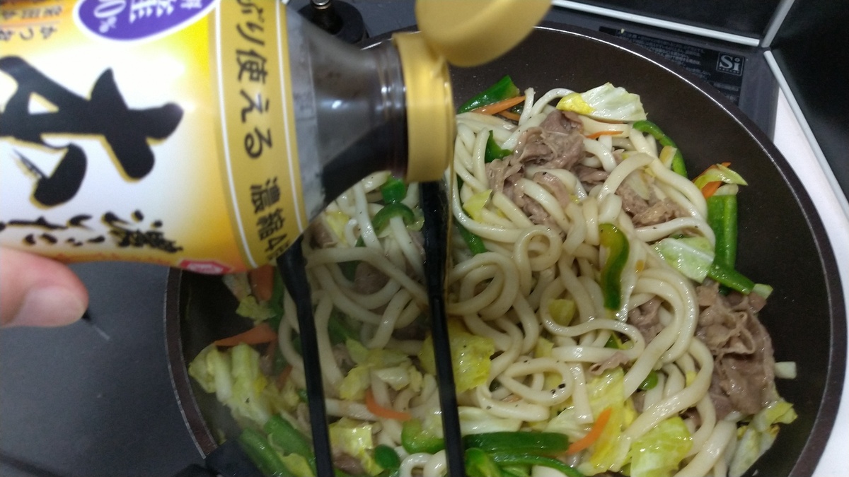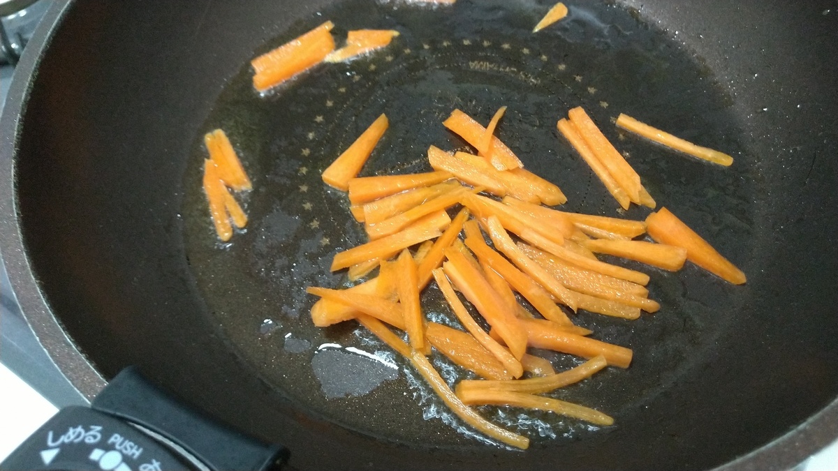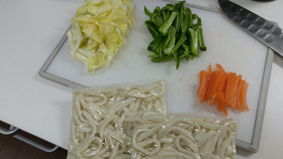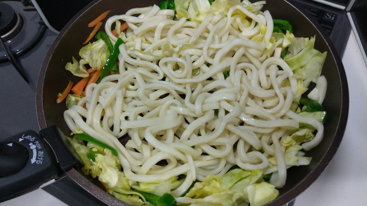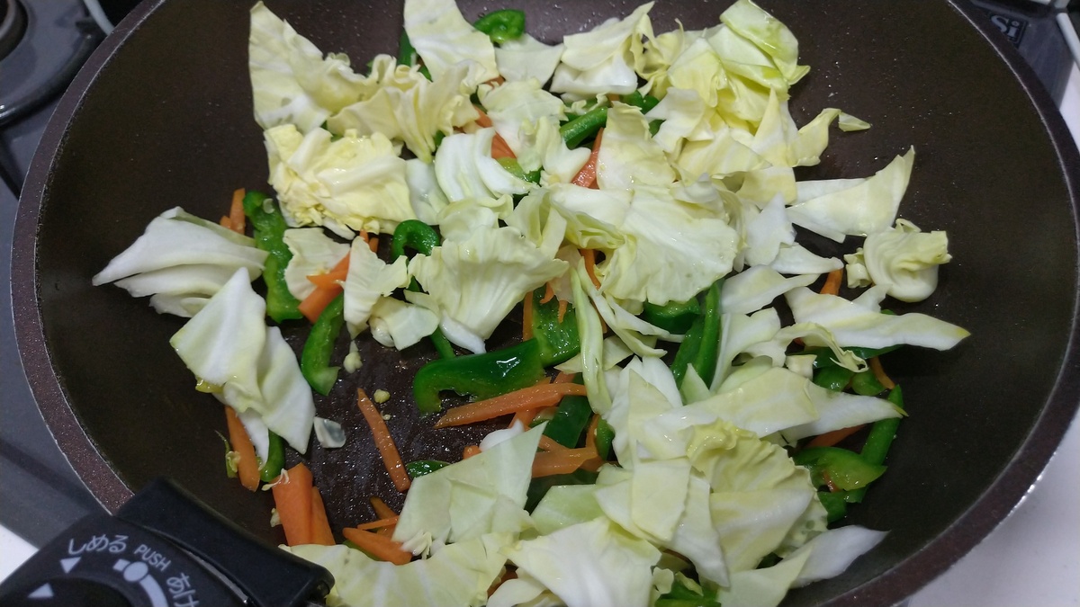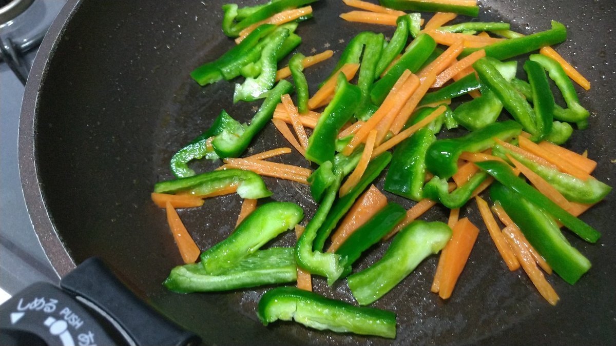 油を引いたフライパンでニンジン、ピーマン、キャベツの順で炒めて、しんなりしたら、うどんを投入。