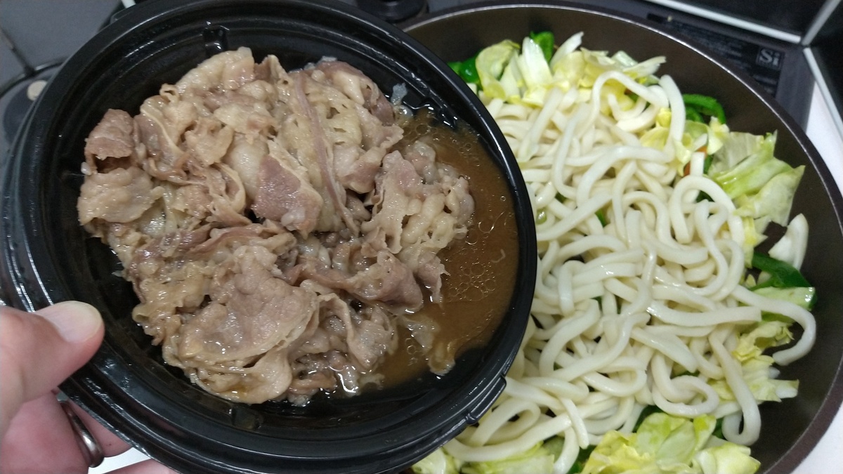 牛皿大盛つゆだくとトッピングネギをテイクアウト。焼きうどんにします。