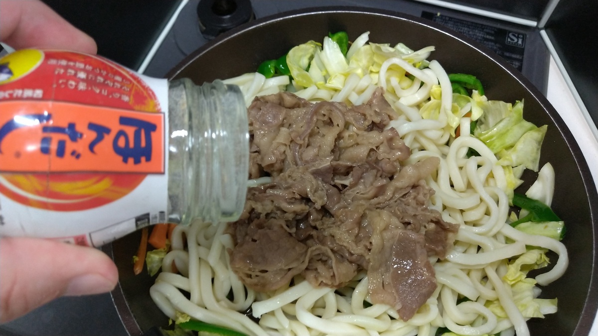 ちょっとほぐしたら、牛皿つゆだくを投入。つゆだくがポイントです。うどんが牛のうまみを吸収してくれます。