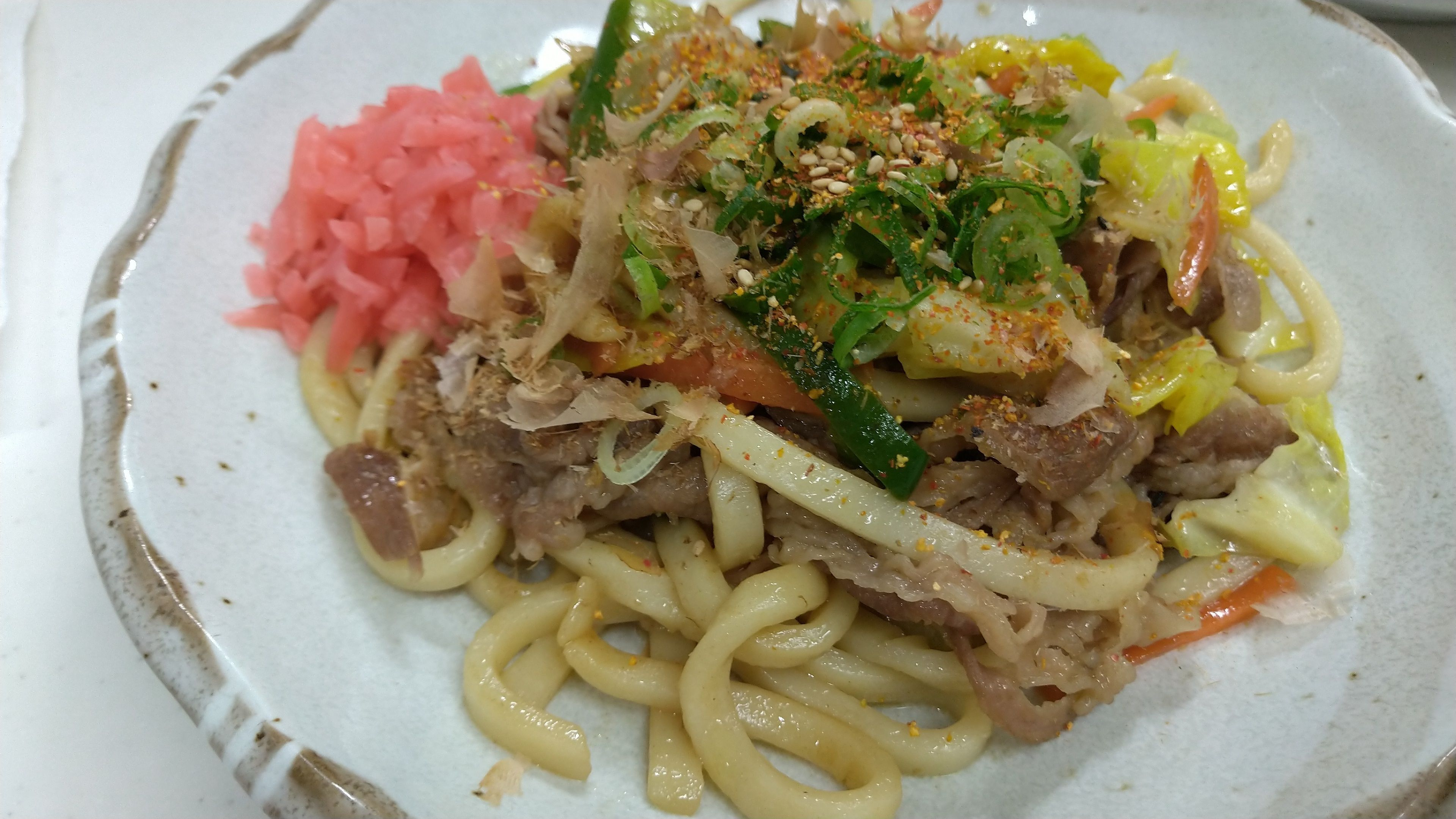 あとは盛り付けて、青ネギ、紅生姜、七味唐辛子、白ごま、かつおぶしをかけてできあがり。