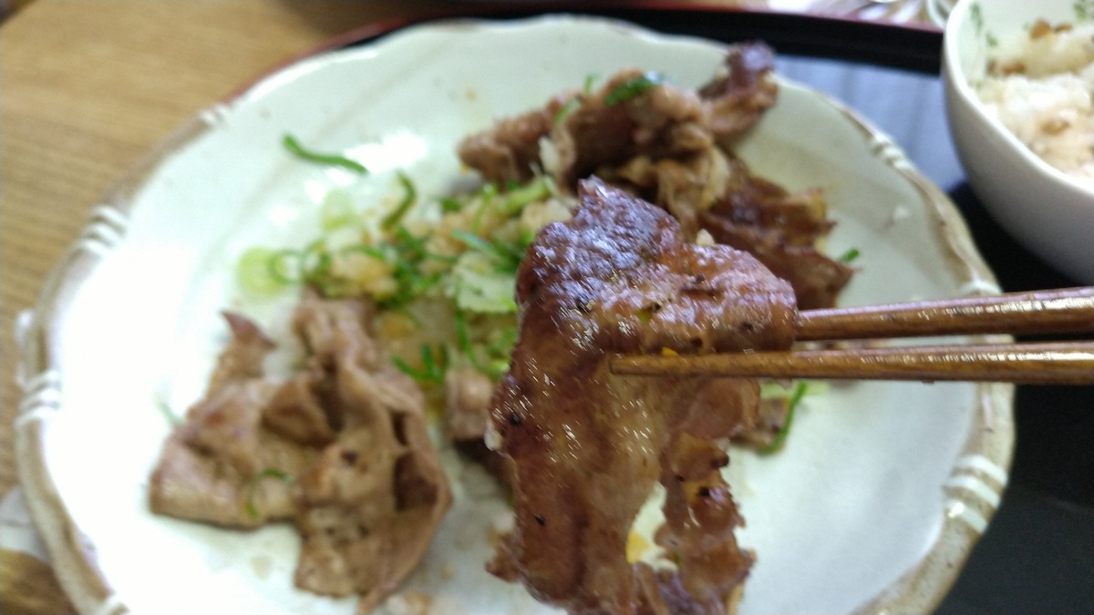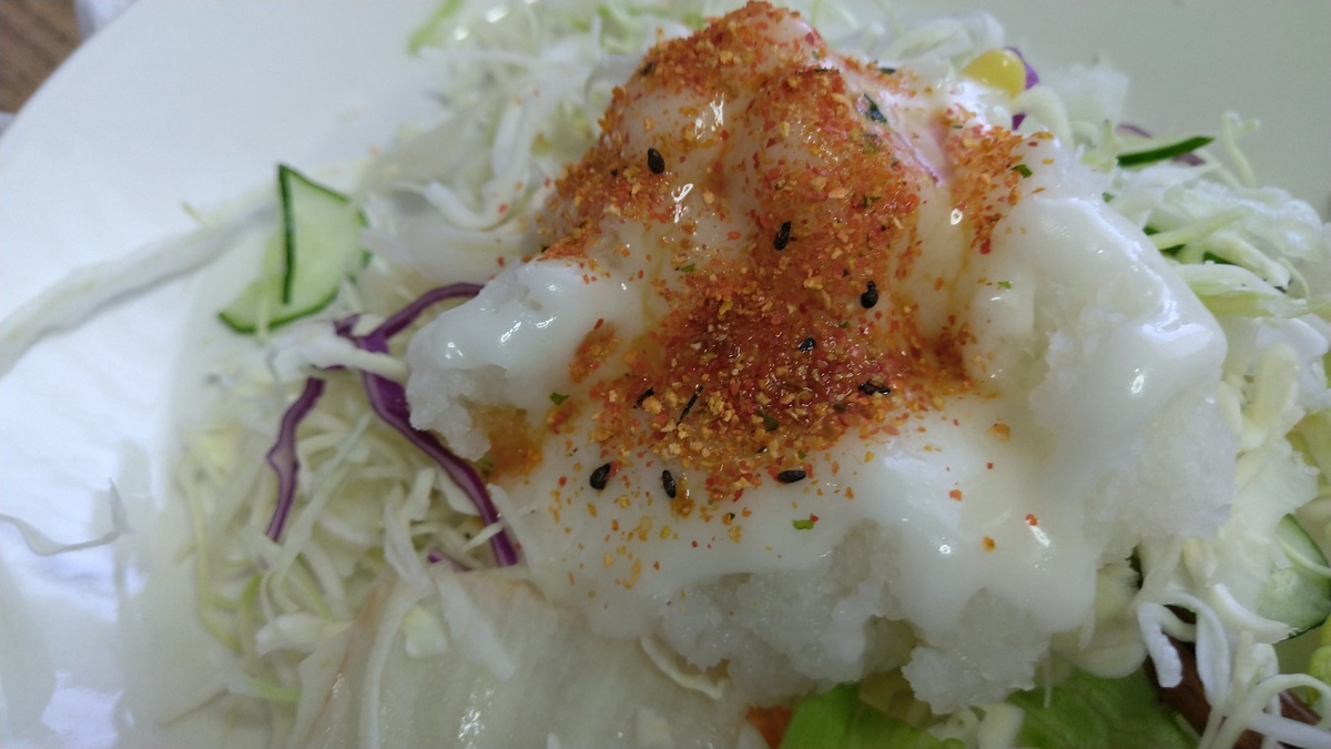 生野菜は大根おろしをかけて、フレンチドレッシングかけて、七味唐辛子かけて、醤油を少したらす、これはおいしい。