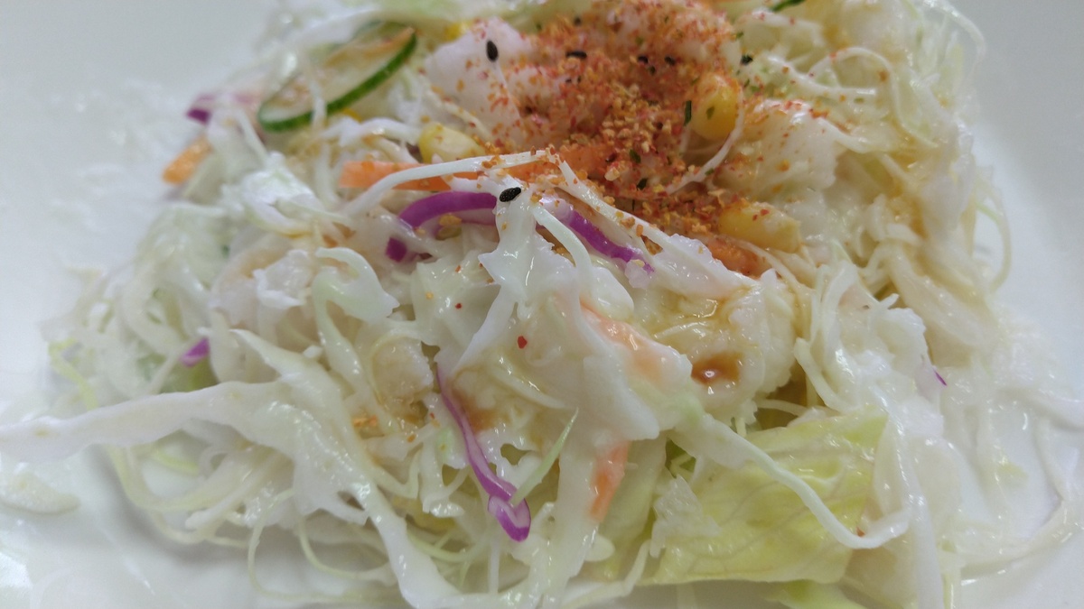 生野菜もフレンチドレッシング:しょうゆ=9:1の割合で混ぜて、大根おろしも混ぜて、生野菜とよく絡める。そこに七味唐辛子をかけたら完璧。