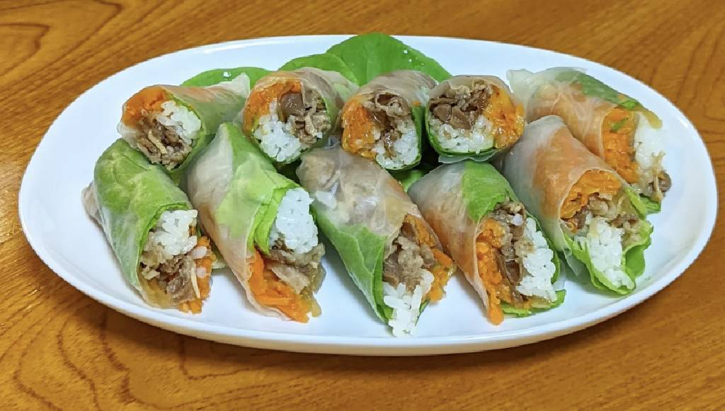 ③ライスペーパーに用意した具材(サンチェと人参ナムル)と牛めしを乗せて巻く