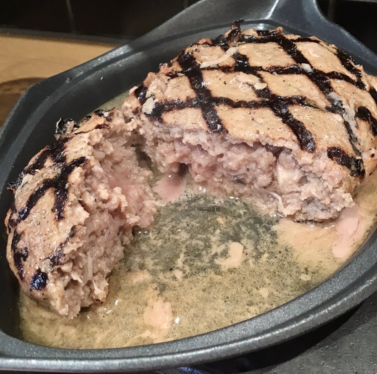 で、少し赤く残ってるところに火を通し、まずは塩胡椒。肉らしい味わいがよいですね。筋の混ざった部分は肉らしい食感だけれど、他はとても柔らかくて、ハンバーグは飲みもの、という、どなたかの言葉の如く😋オリジナルソースも試してみたのだけど、シンプルに塩胡椒の方が好みだなぁ。最後に肉汁にライスを少し投入して、美味しく😊