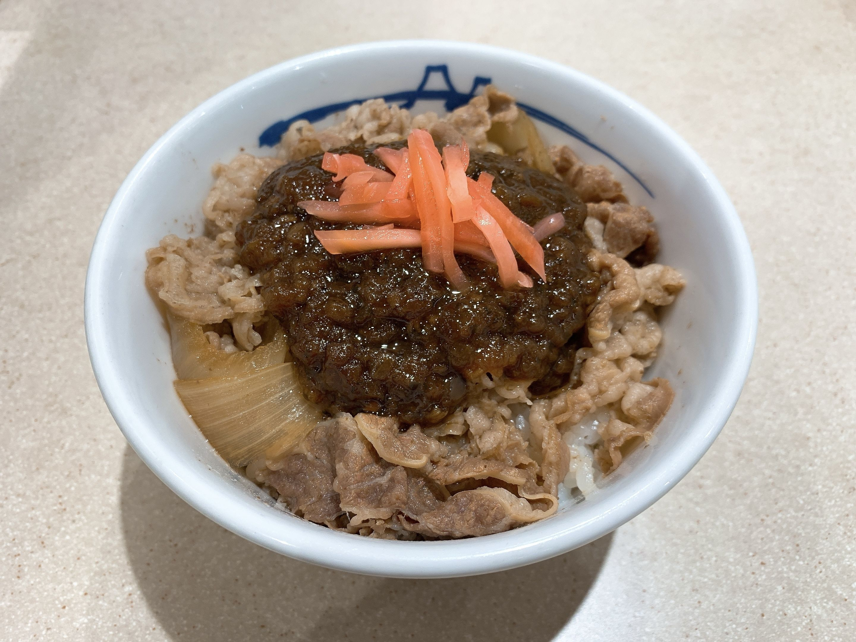 ①牛めし(つゆ抜き)の上にシャリアピンソースをかける