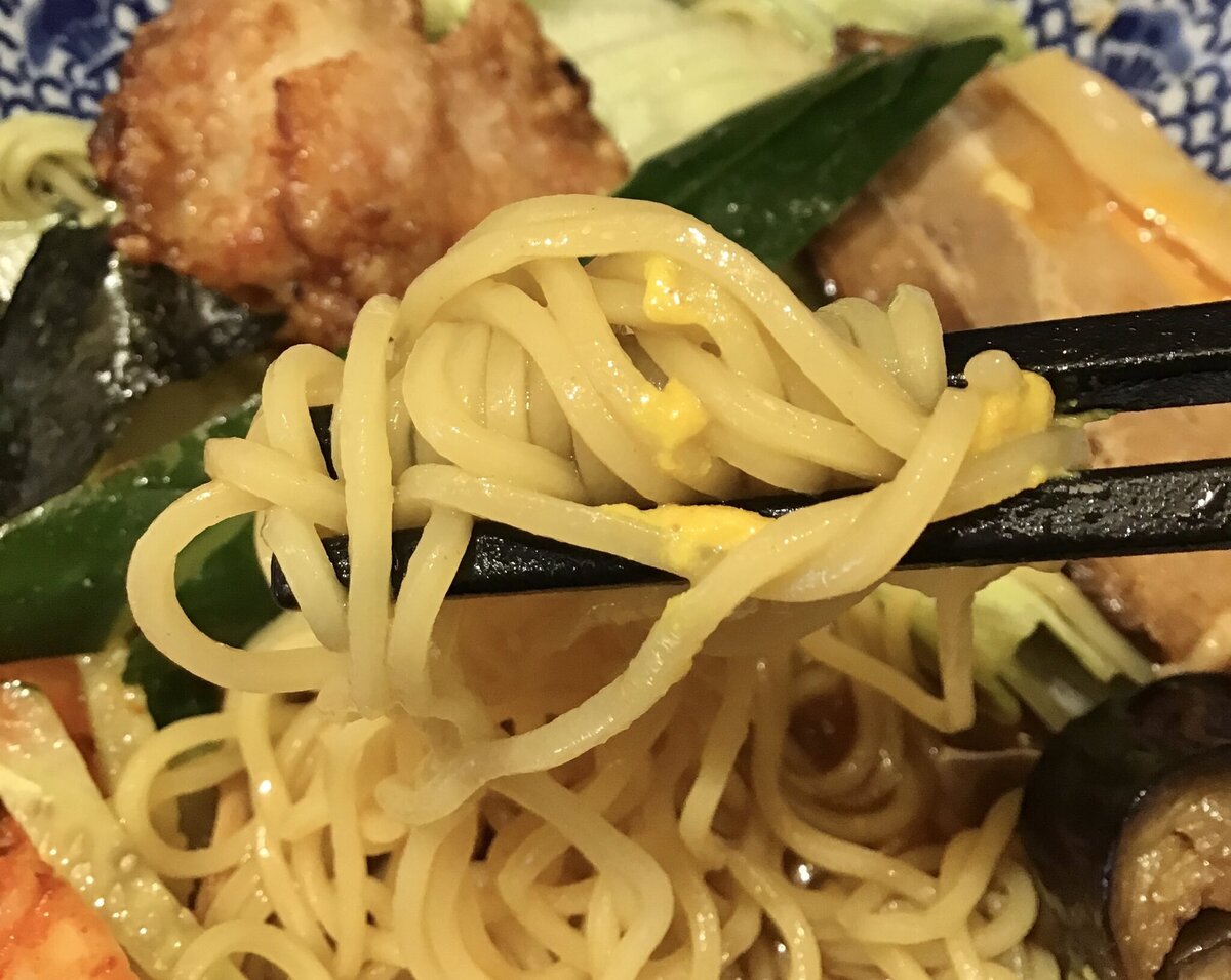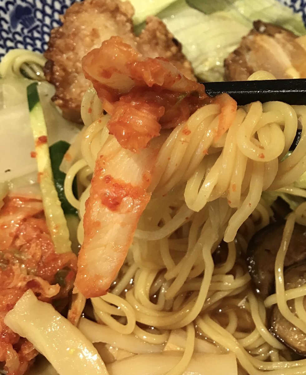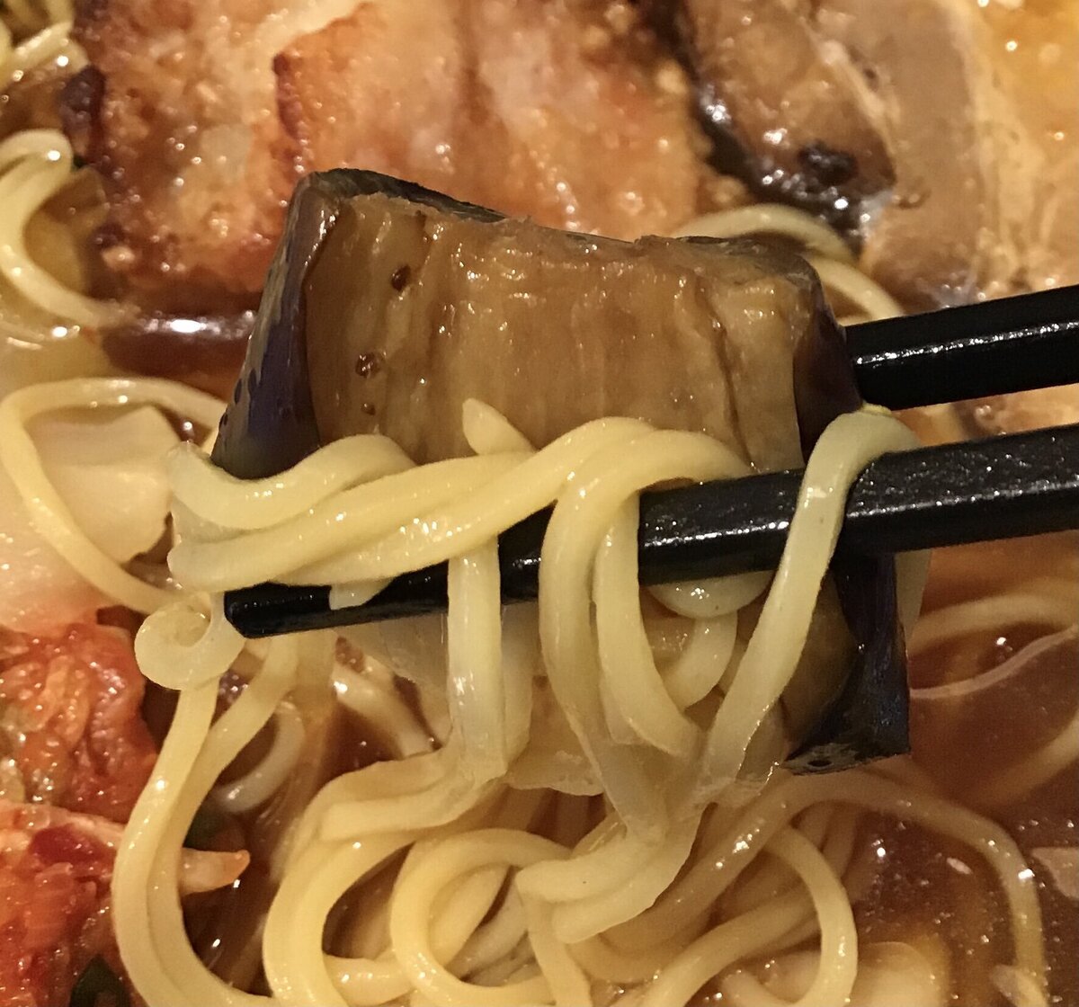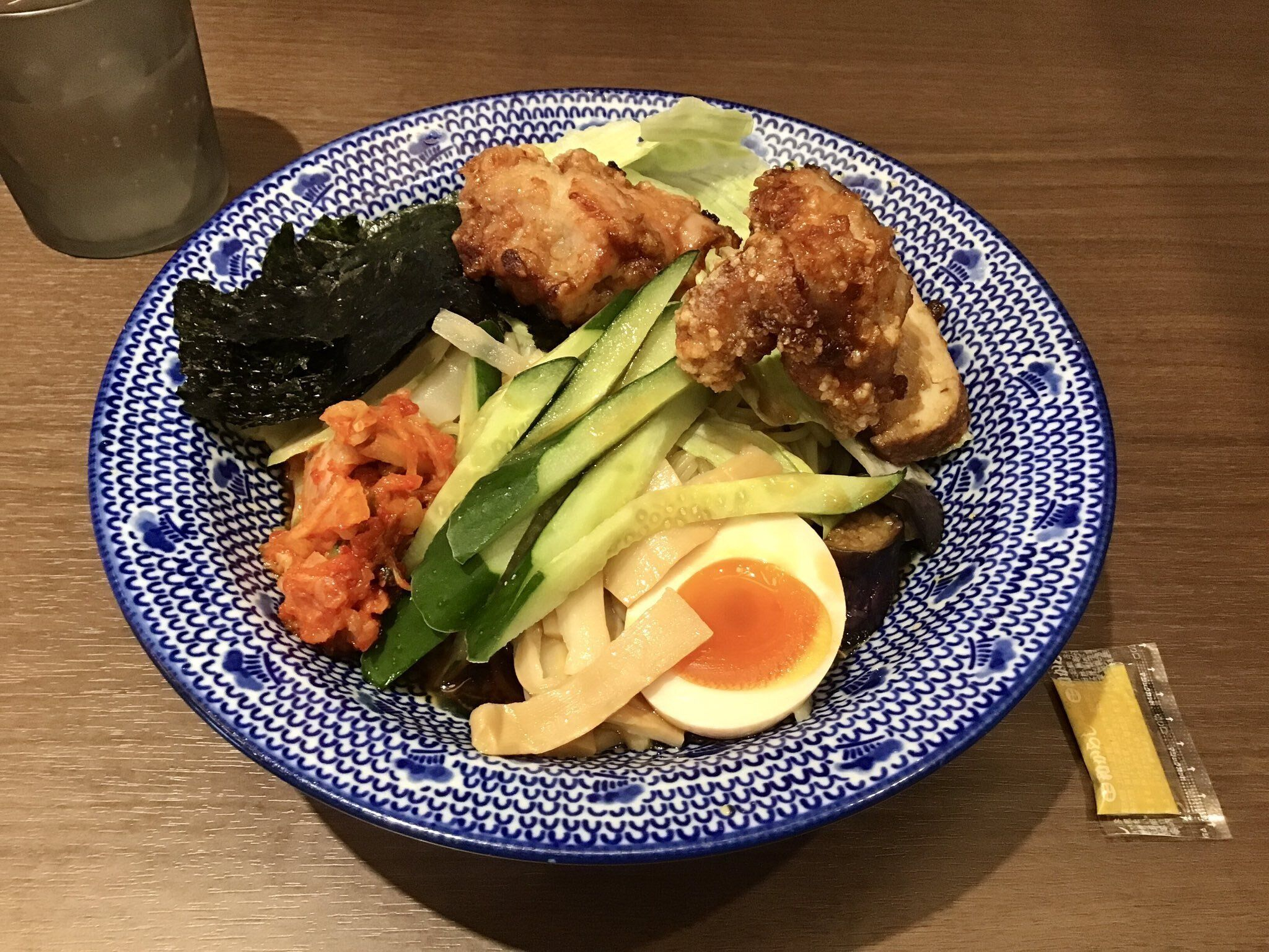 なかなかいい仕事してる。海苔やメンマは、ラーメンを意識して入れてるのかもだけど、タレの酸味に負けてしまうかな?。ザーサイも同様。レタスはよいのだけど、カットが大き過ぎて食べ辛い。卵や唐揚は文句なく。焼豚は、追加したいぐらい美味しい。ナスも美味しいけど、