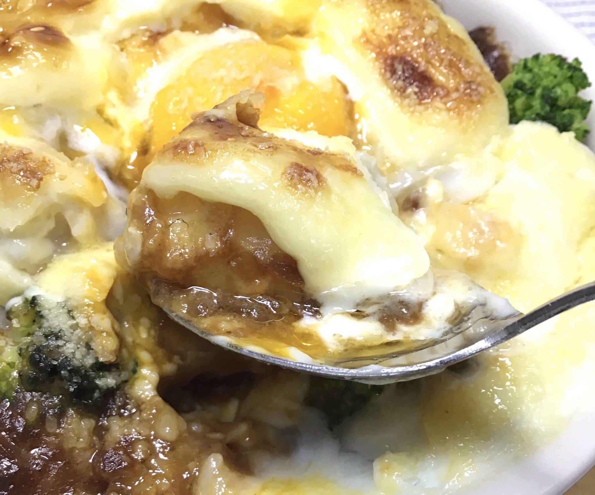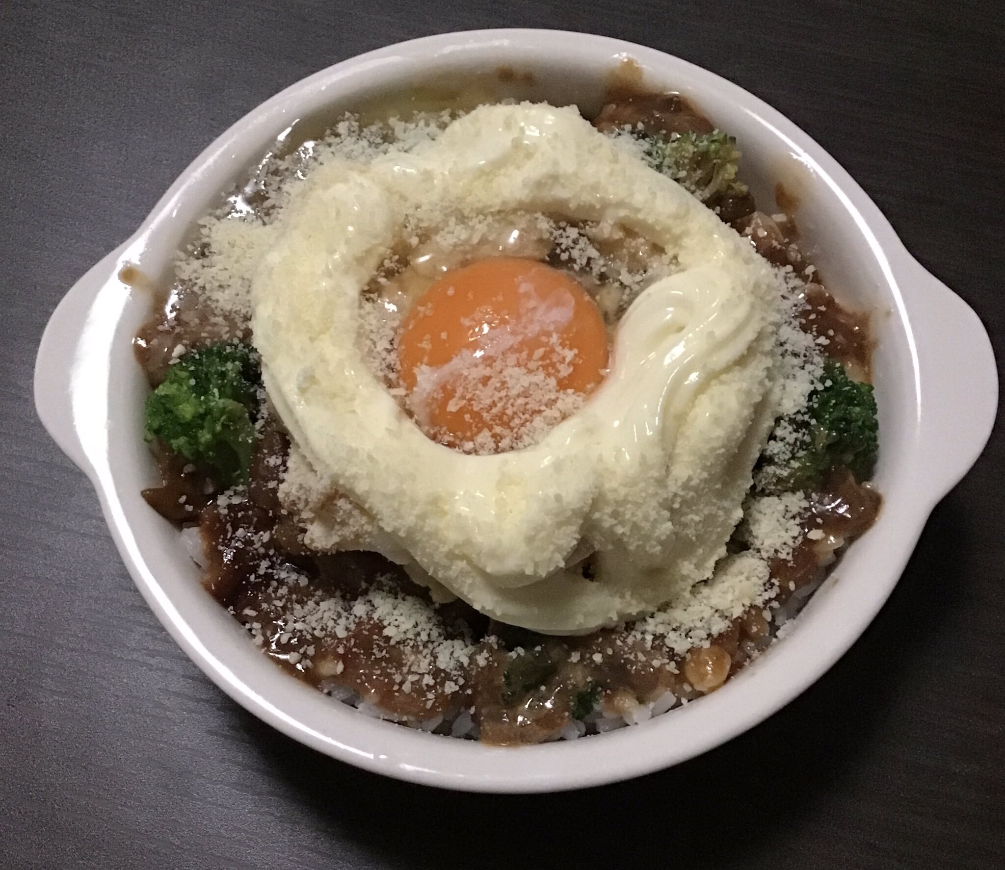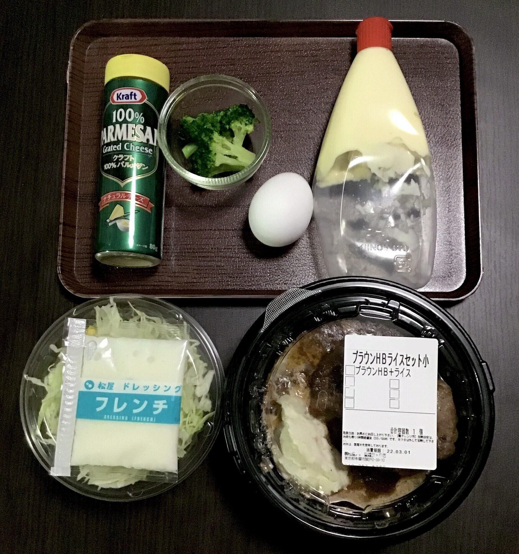 ブラウンソース+ハンバーグ+ポテサラ+マヨ+卵が、ご飯ともよく合って、何とも美味しく頂きました(が、ハイカロリー....💦)