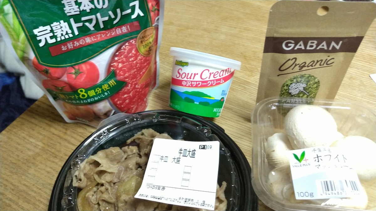 牛皿買ってきてビーフストロガノフみたいにしてみた。