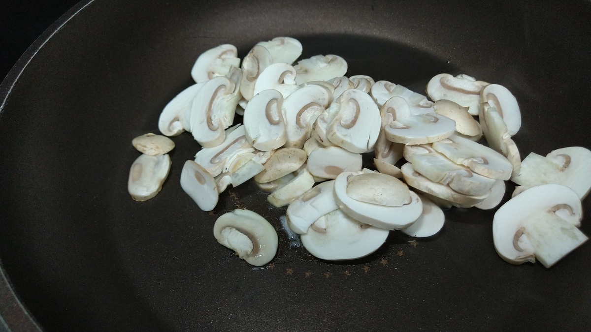フライパンでバターを温め、マッシュルーム薄切りを投入。薄力粉をまぶして、中火で5分くらい炒める。