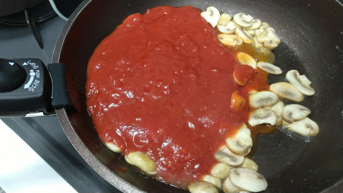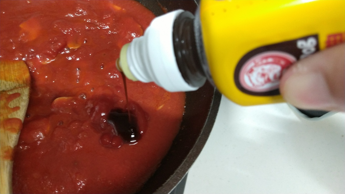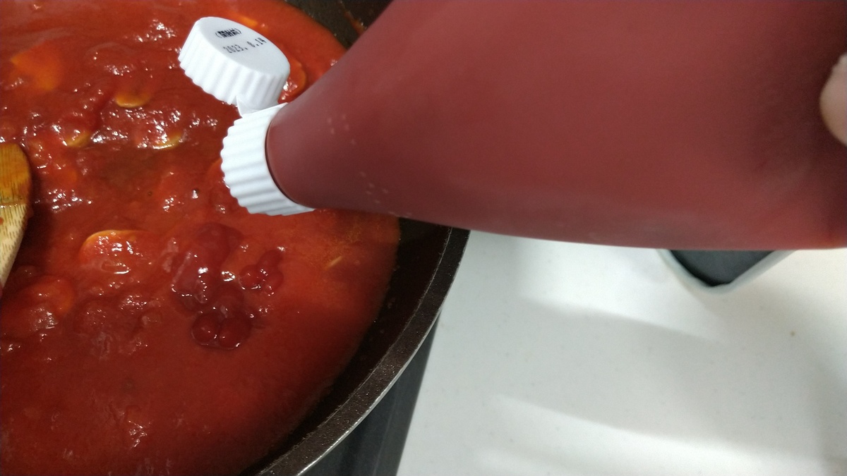しんなりして粉っぽさがなくなったら、基本の完熟トマトソースを投入。
