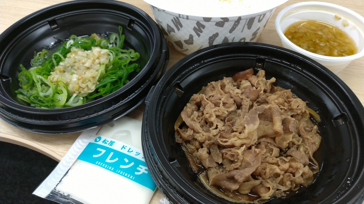 そしてお昼はやっぱりネギねぎ牛めしにフレンチドレッシング。ネギタレも追加。これで、松弁ポイントも200ポイント上乗せ。この組み合わせだと、ネギねぎ牛めし520円+ネギダレ180円=700円で、プラチナなら284ポイント還元、還元率は脅威の40.6%、実質416円で食べられる。もう他のもの食べる気にならない。
