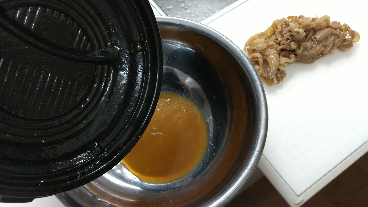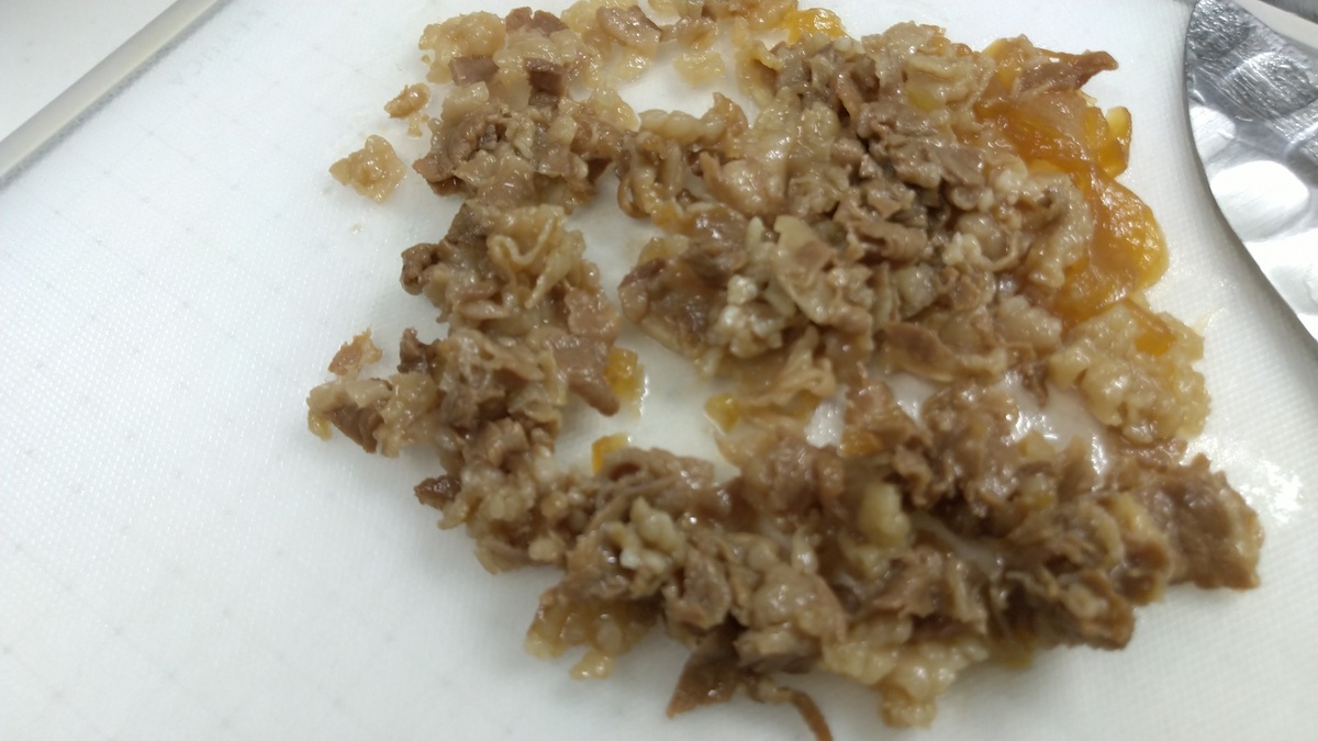 その間に、牛皿の具を細かく刻みます。つゆはボールに取っておきます。
