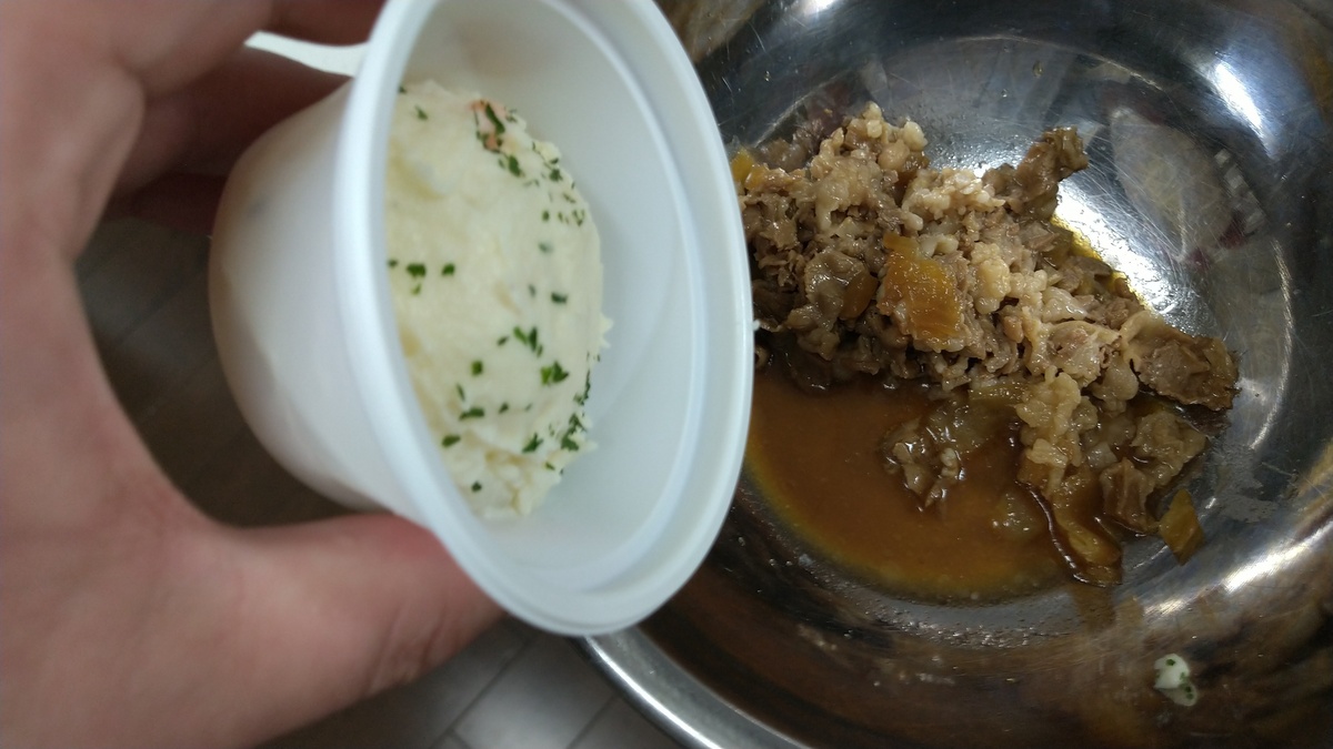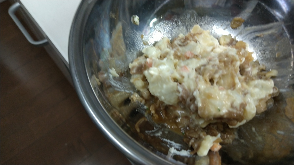 このボールに刻んだ具とポテト2つを投入してよく混ぜます。