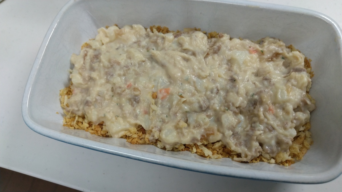 ちょっと深めのお皿に、炒りパン粉を半分敷き詰めて、そこにボールの中身を平らになるよう盛り付けます。