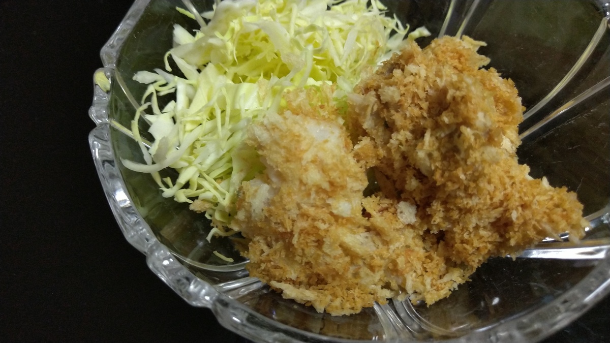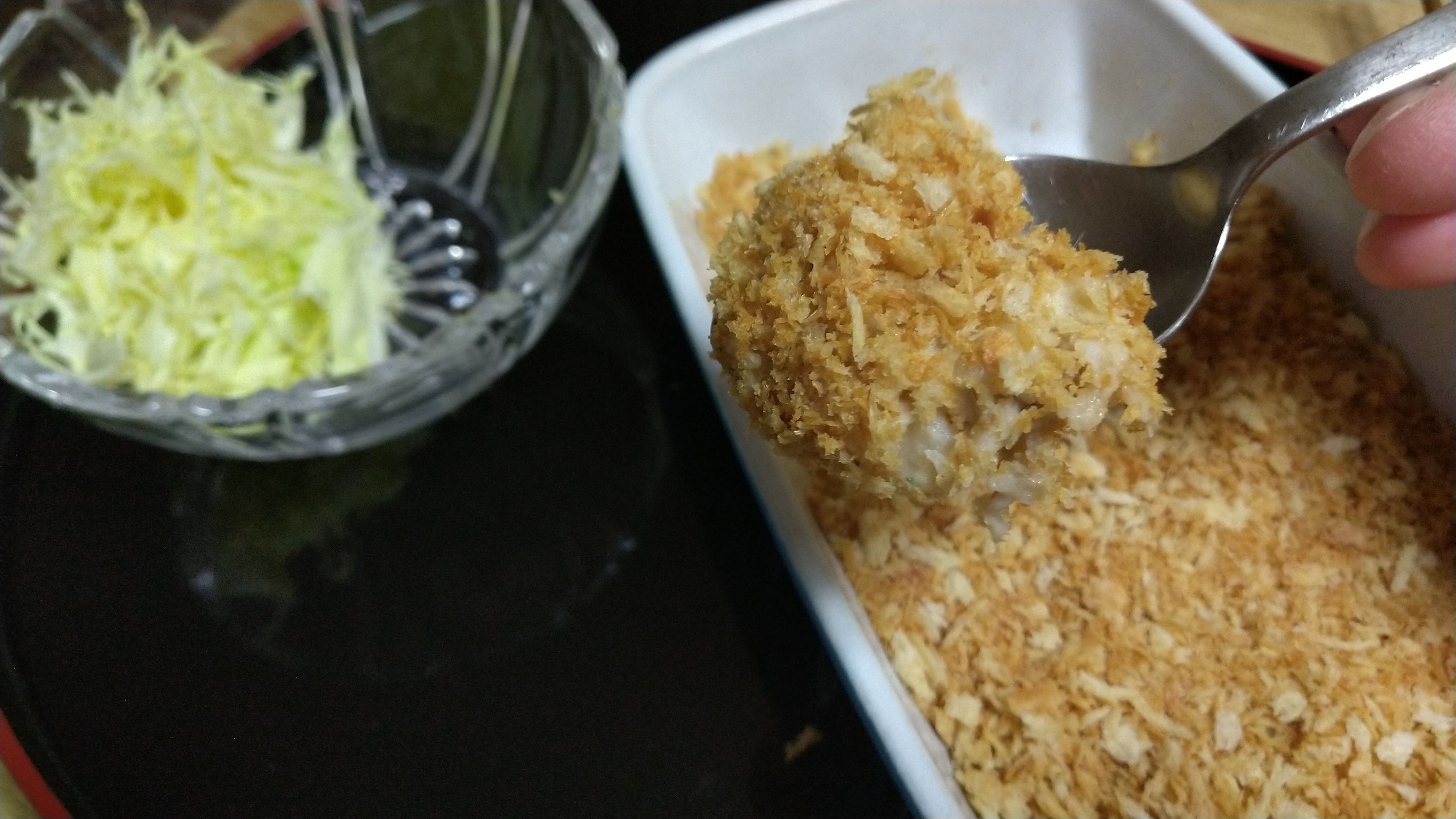 すくった断面にも炒りパン粉をまぶしていただきます。