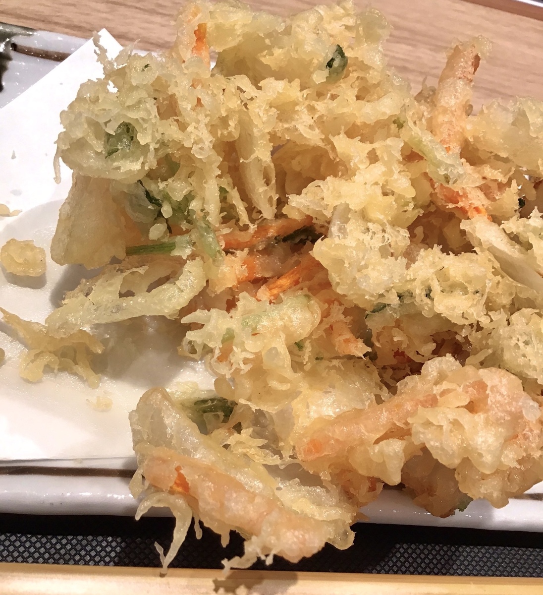かき揚げも、にんじんや三つ葉、甘さを感じる玉ねぎが、こちらも薄い衣で上手く繋いであって、