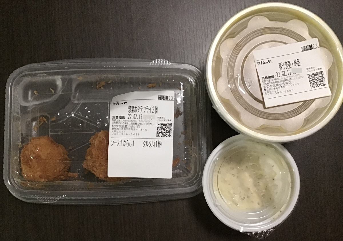 手ぶらで帰るのも何なので、ホタテフライと、今だけお安い豚汁をテイクアウトして、遅めのお昼に。